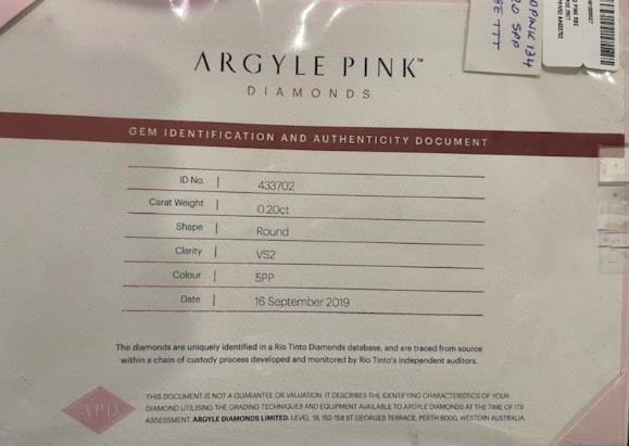 This fancy pink, 0.55ct 7PP SI2 round brilliant cut diamonds with Argyle and GIA certificates, cut, graded and released for sale from the Argyle diamond mine in Western Australia is sold for investment or for jewellery.