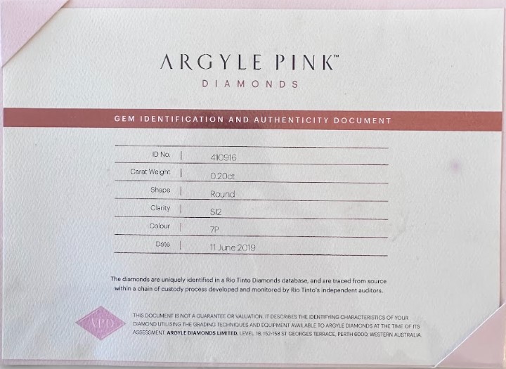This premium colour grade fancy pink, 0.20ct 7P SI2 round brilliant cut diamonds with certificate number 410916, cut, graded and released for sale from the Argyle diamond mine in Western Australia is sold for investment or jewellery.