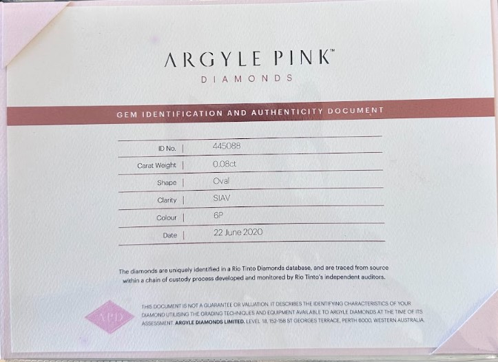 This matched pair of premium colour grade fancy intense pink, 0.08ct each 6P SI oval cut diamonds with certificare numbers A445088 and A383456, cut, graded and released for sale from the Argyle diamond mine in Western Australia are sold as a matching set for investment or for jewellery.