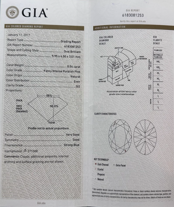 | Colour | 5PR / FIPP - Pink Rose / Fancy Intense Purple Pink |