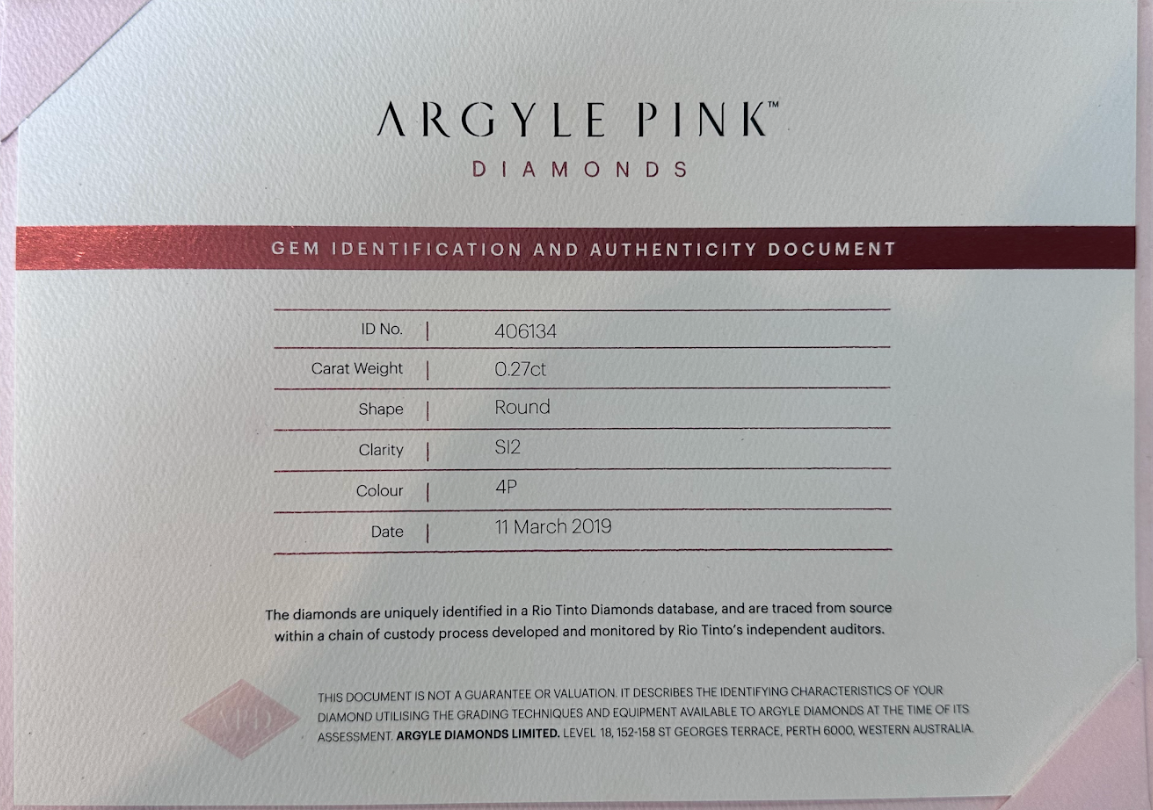 | Colour | 4P / Fancy Intense Pink |